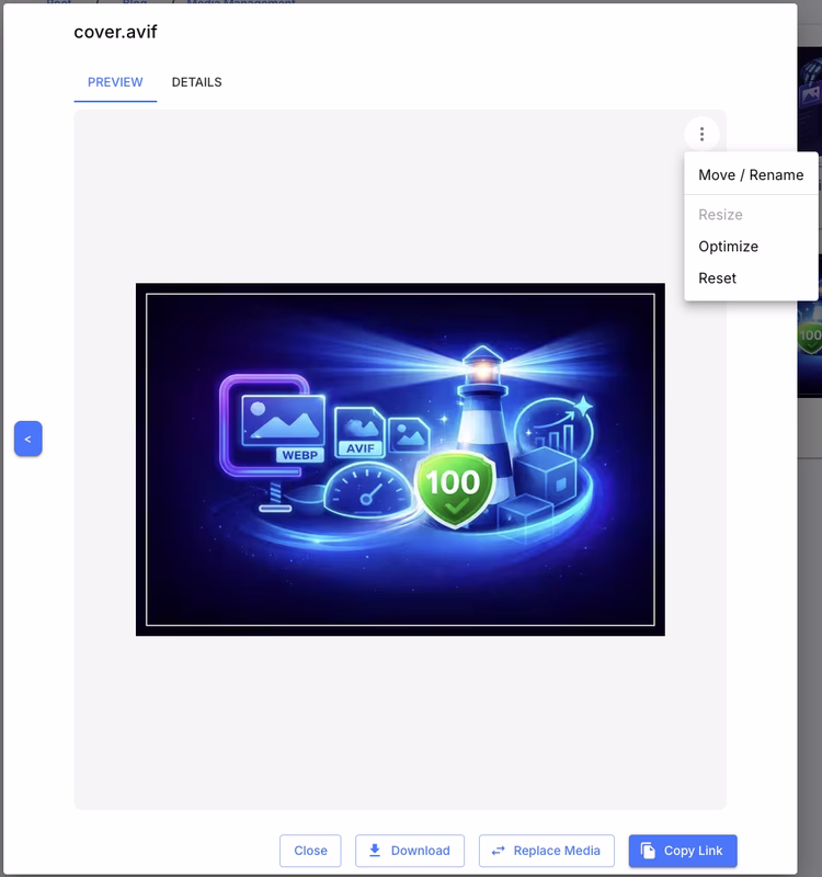 LeadCMS makes optimisation visible. In the Media Preview dialog you can: