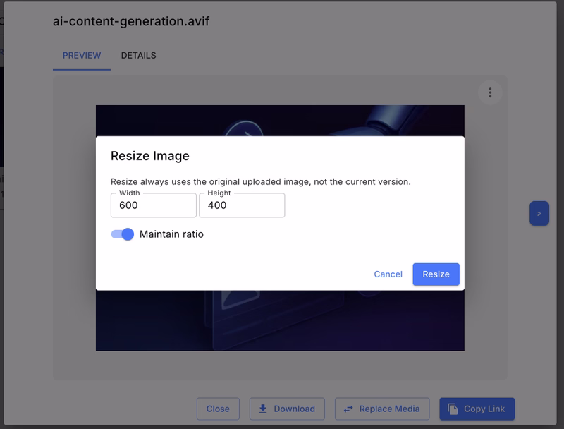LeadCMS includes a Resize tool directly in the media UI. It’s ideal for:
